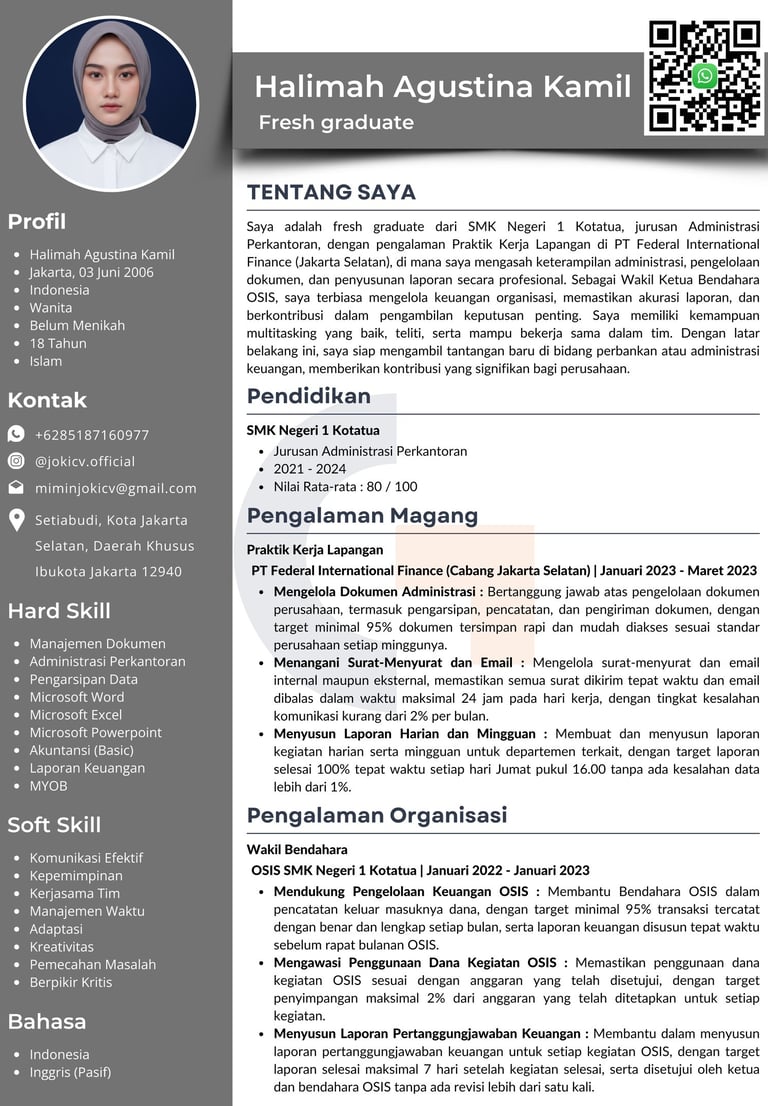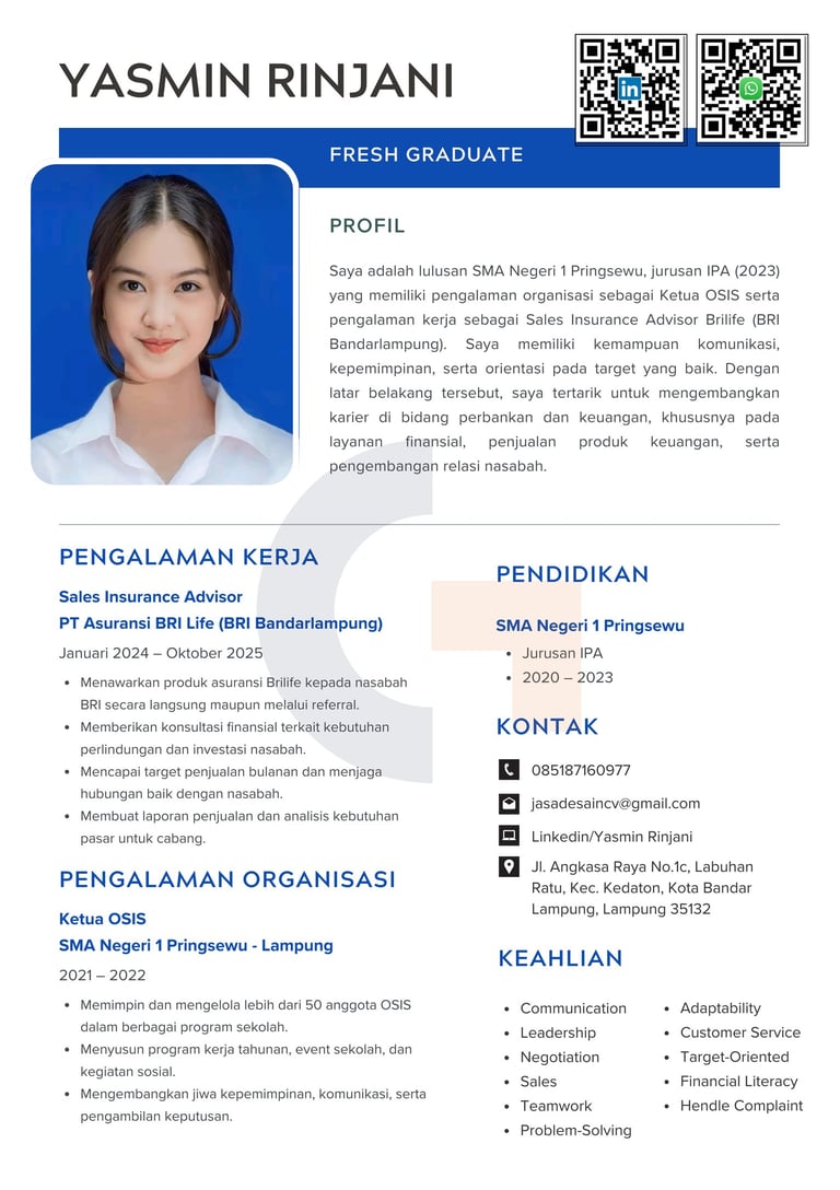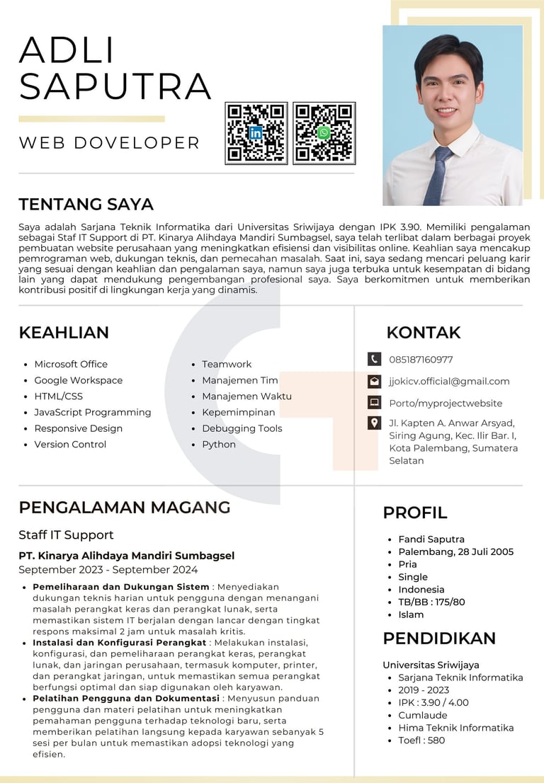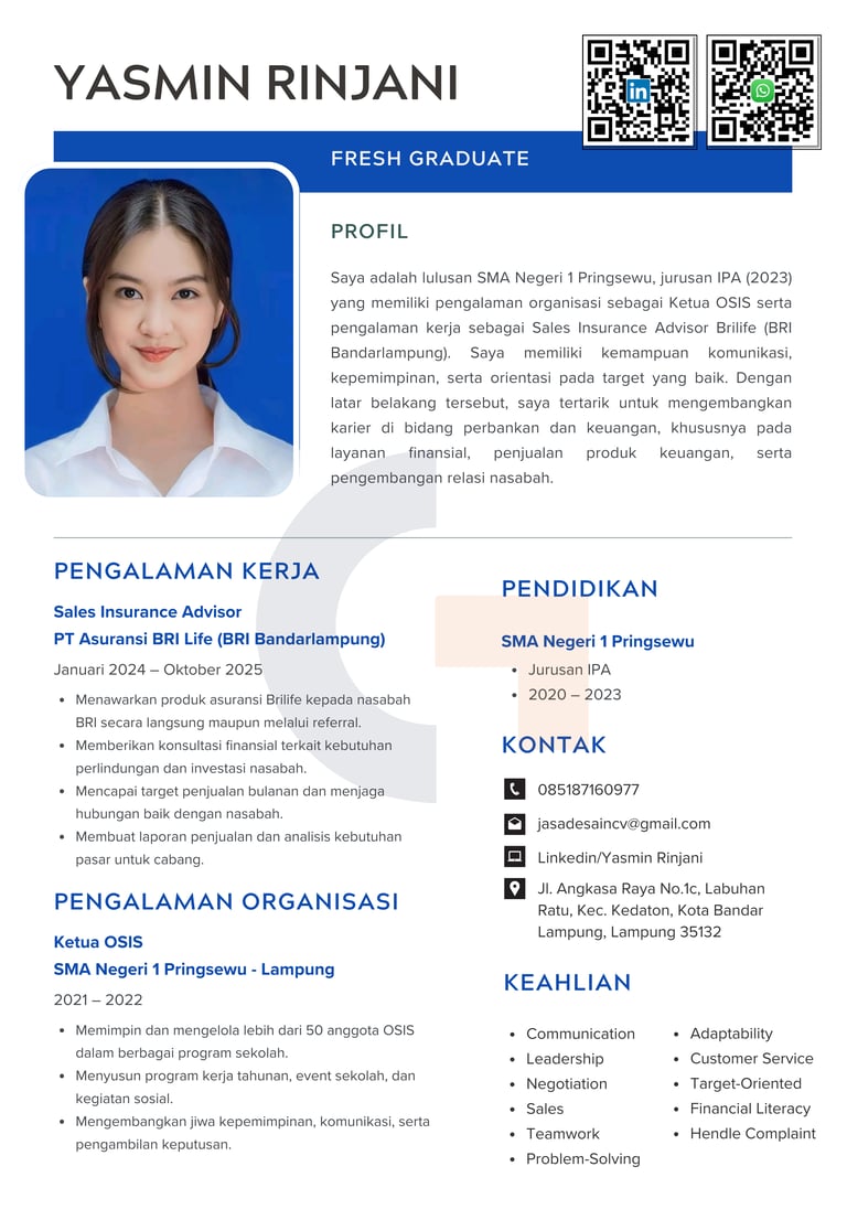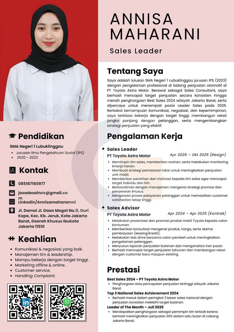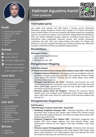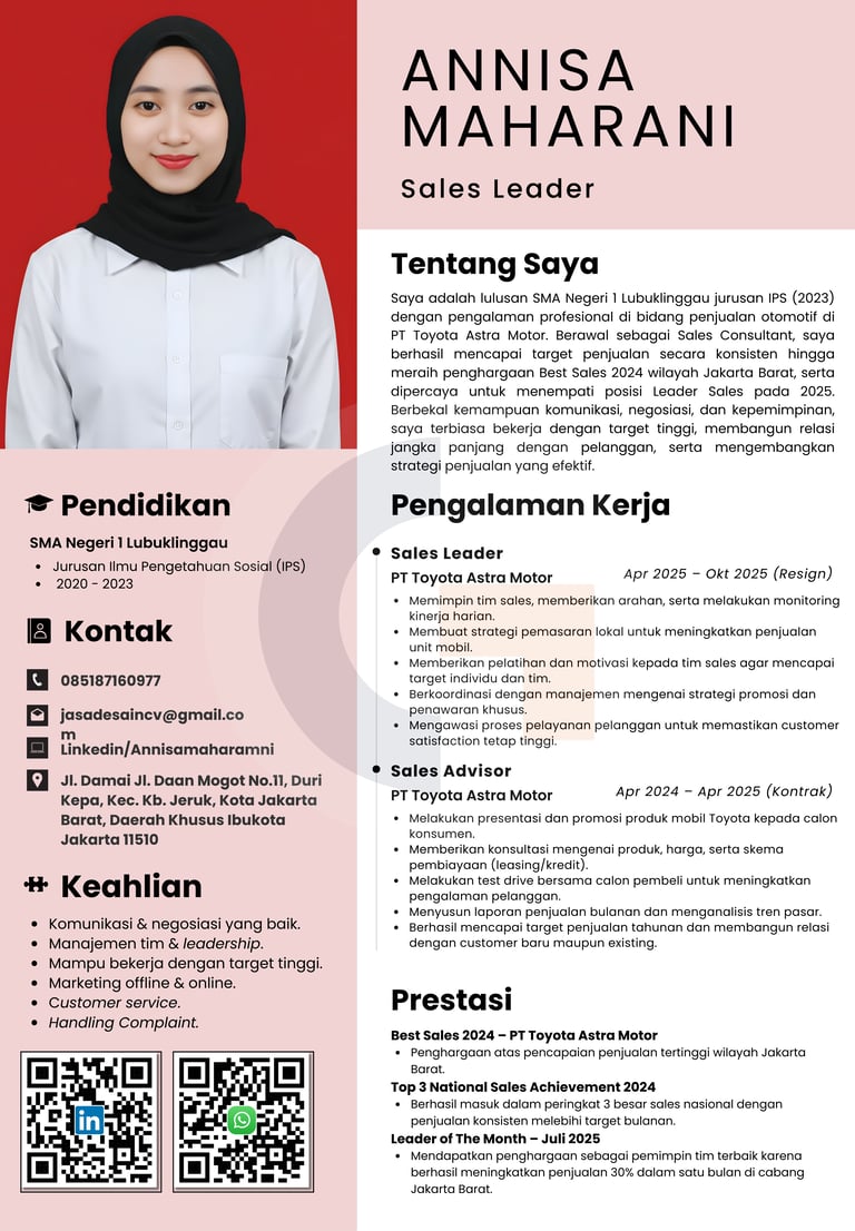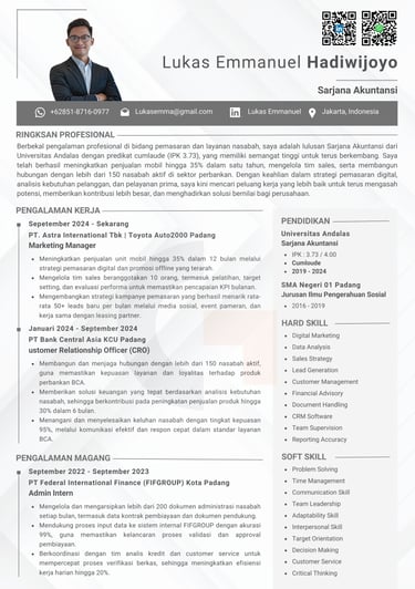 "Kami mengerti pentingnya kesan pertama saat melamar kerja. Karena itu, kami siap membantu membuat CV berkualitas yang sesuai dengan kebutuhan Anda, supaya peluang untuk dipanggil interview jadi lebih besar. Yuk, konsultasi gratis sekarang!"